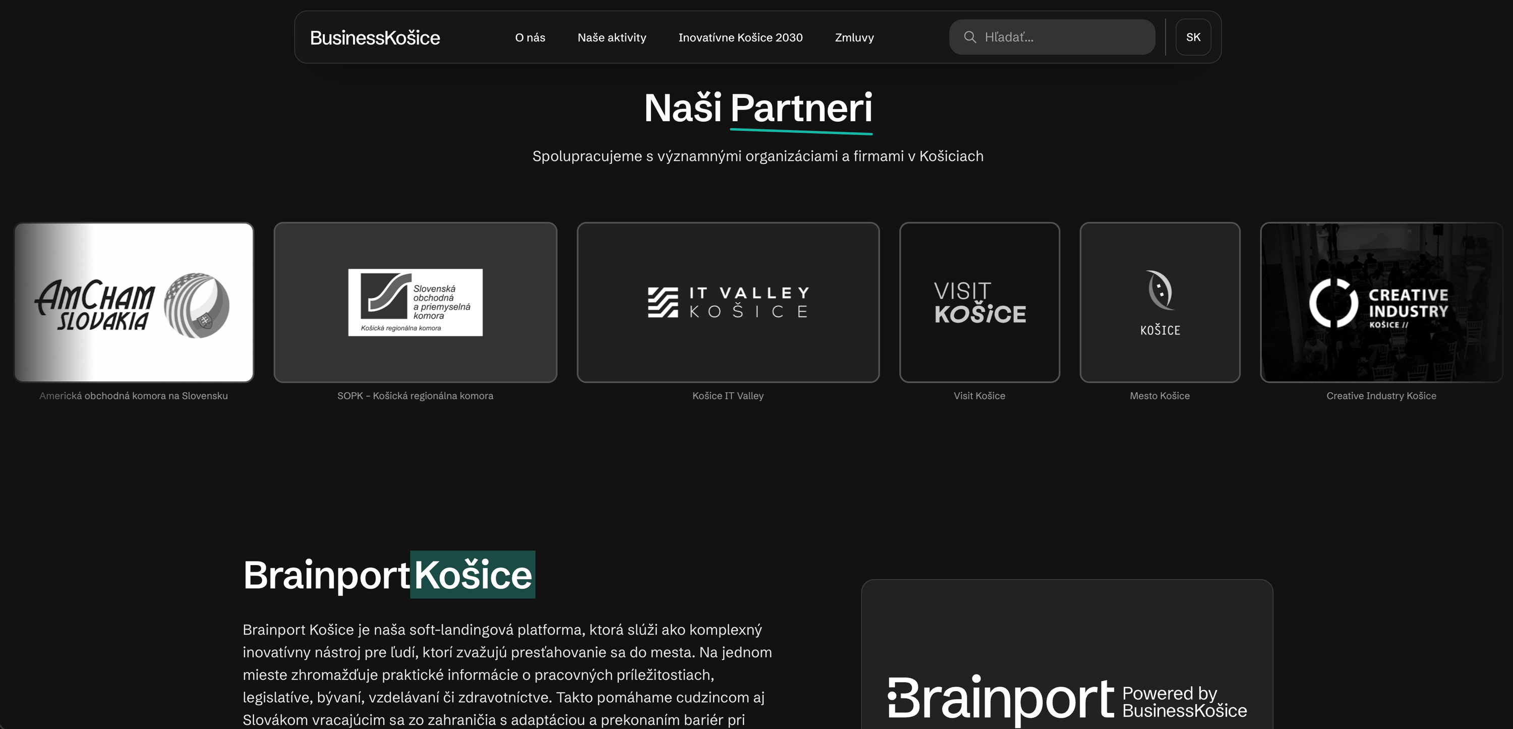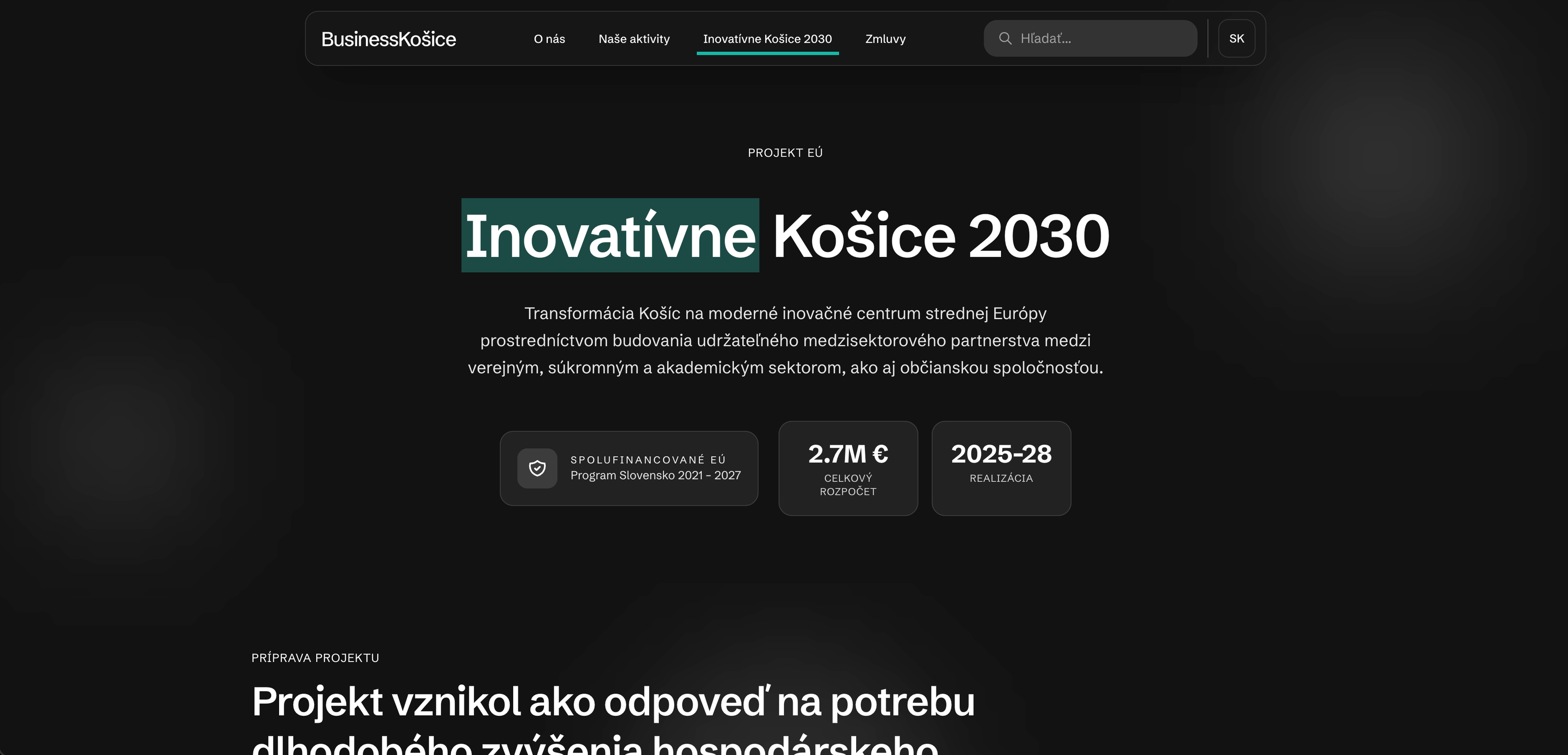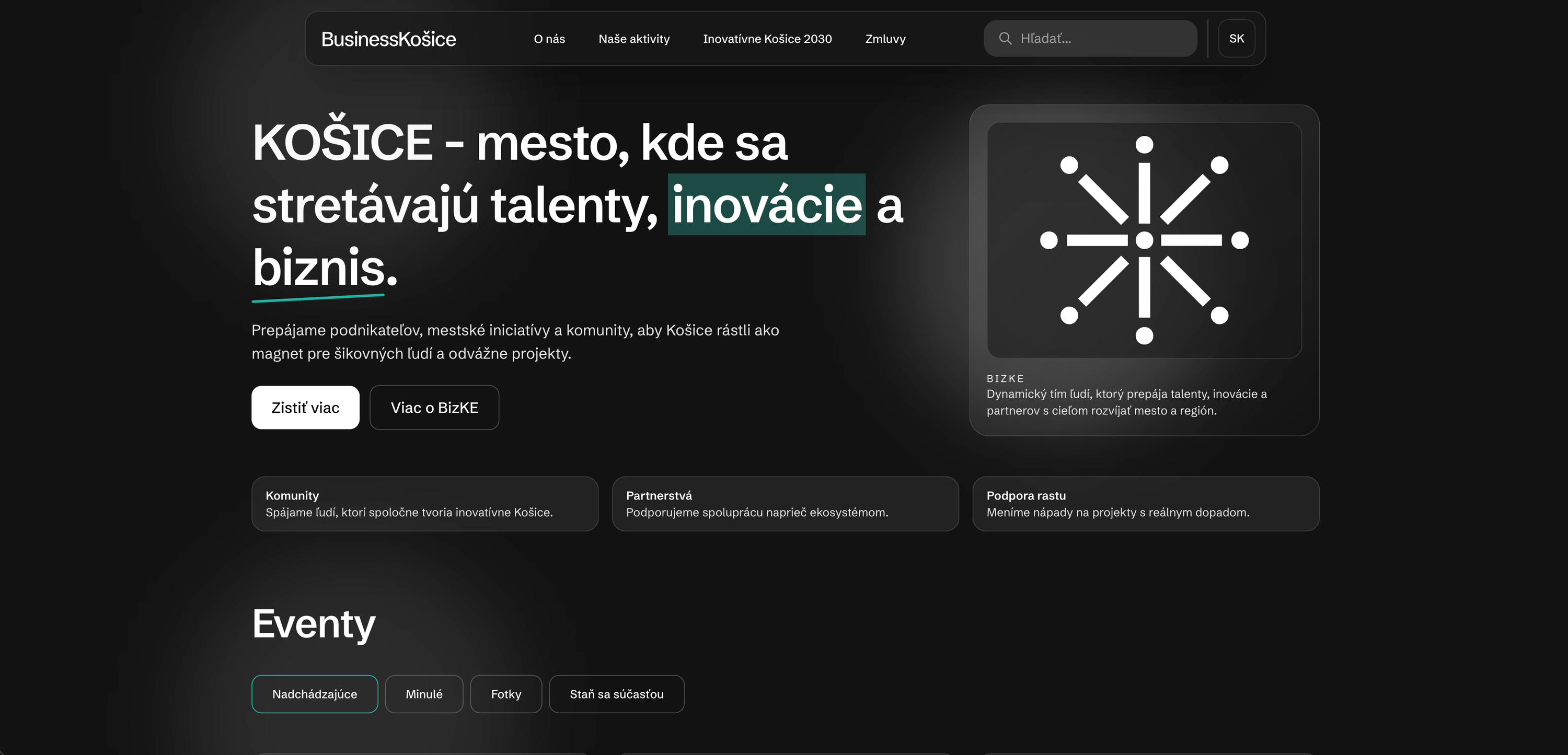 Business Košice is a web platform developed for a non-profit organization focused on supporting entrepreneurship, innovation, and talent development in the Košice region. The goal of the project was to create a modern, clear, and trustworthy online presence that effectively communicates the organization’s mission and activities to a broad audience.